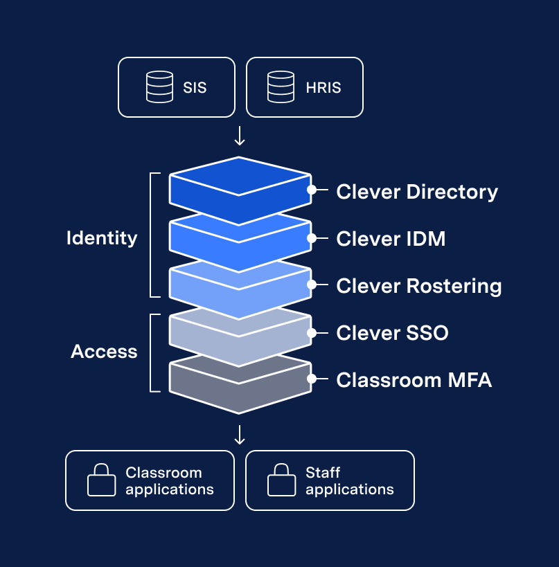 Layered security from Clever provides multiple layers of protection to enhance district cybersecurity, all with one trusted vendor. These solutions, uniquely designed for the needs of K-12, provide protections for the entire district community, including teachers, students, and staff. The identity and access management offering includes: