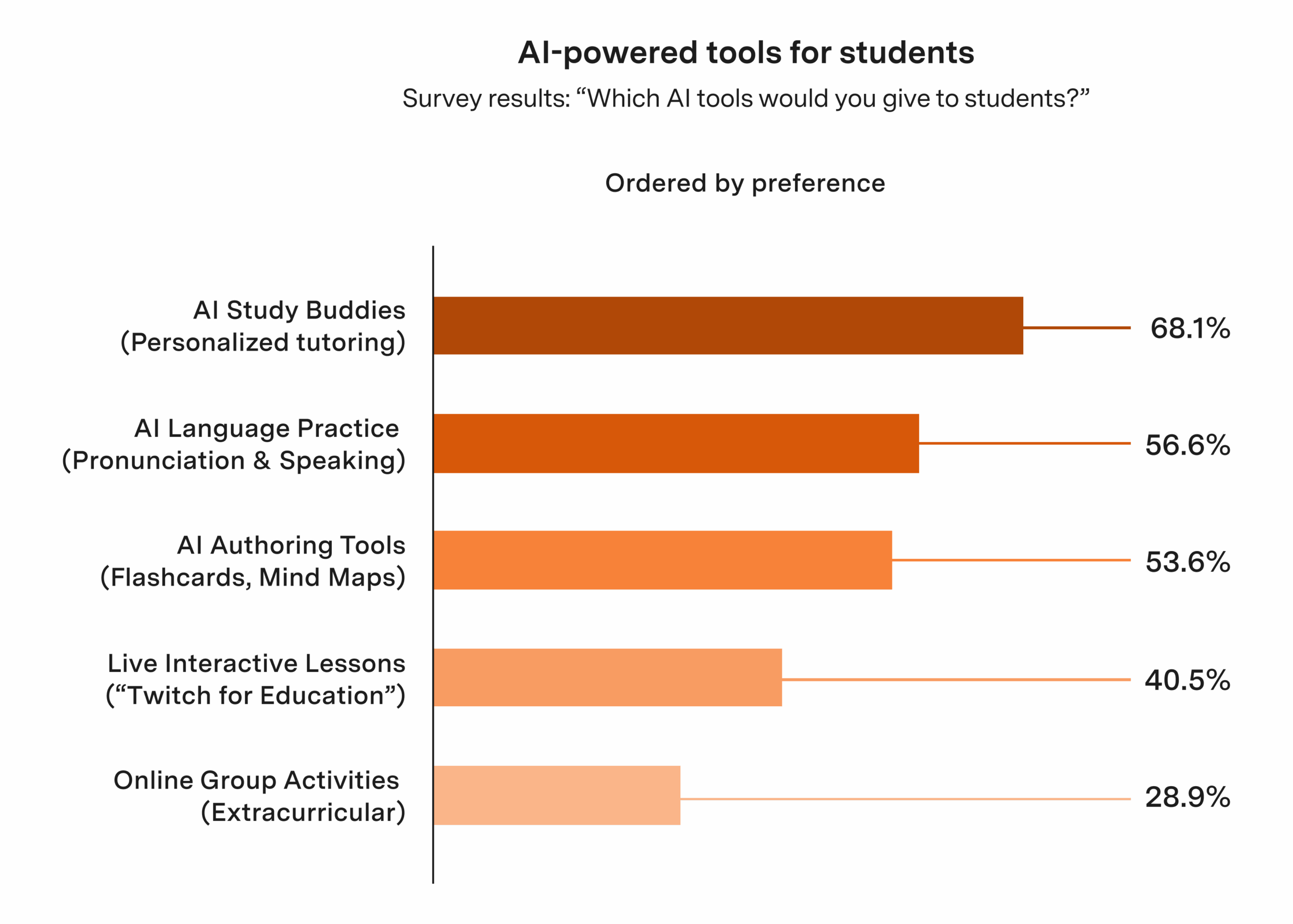 68% of teachers support AI-powered study buddies to assist students, offering scalable help amid staffing challenges.